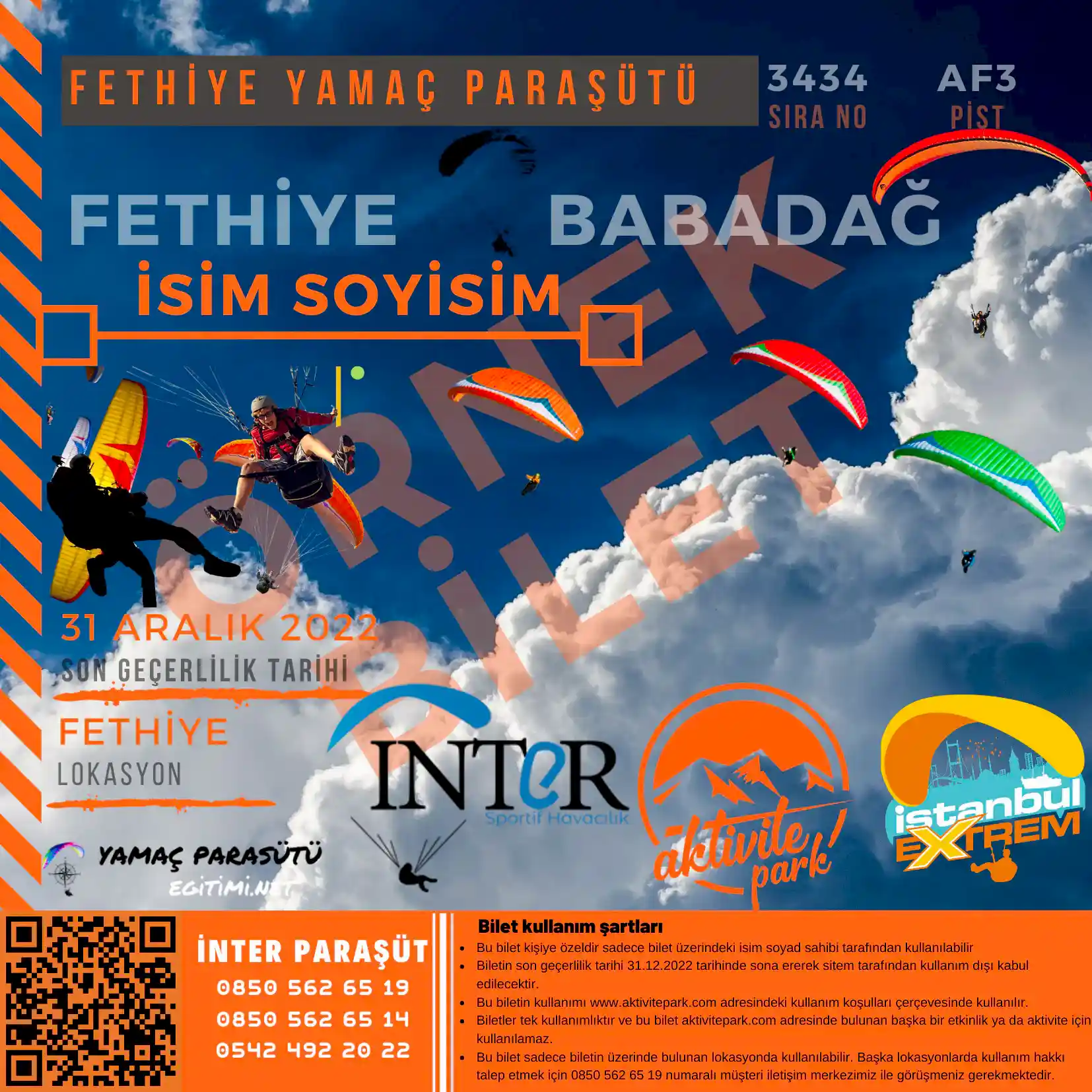 Fethiye yamaç paraşütü deneyimi yaşamak isteyenler için İnter Paraşüt, profesyonel ekibiyle hizmet veriyor. Bu deneyimi ilk kez yaşayacak olanlara THK lisanslı uzman pilotlar eşlik ediyor. Yamaç paraşütü uçuşlarına katılmak isteyenler için uçuş kartları sunuluyor. Kartlar, satın alınan yıl boyunca geçerliliğini koruyor ve istenen tarihte kullanılabiliyor. Bu eşsiz deneyimi ölümsüzleştirmek isteyenler ekstra ücret ödemeden fotoğraf ve video hizmeti alabiliyor.